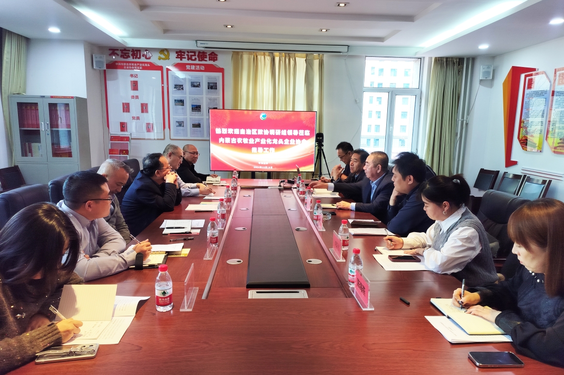 2024年12月18日下午,自治區(qū)政協(xié)委員、港澳臺僑聯(lián)絡(luò)和外事委員會(huì)主任張波,內(nèi)蒙古工業(yè)大學(xué)僑聯(lián)副主席新巴雅爾,內(nèi)蒙古航空職業(yè)技術(shù)學(xué)校校長、內(nèi)蒙古航空運(yùn)動(dòng)協(xié)會(huì)會(huì)長趙自強(qiáng),自治區(qū)政協(xié)港澳臺僑聯(lián)絡(luò)和外事委員會(huì)辦公室主任安勝利一行6人來協(xié)會(huì)調(diào)研指導(dǎo)工作,協(xié)會(huì)副會(huì)長單位內(nèi)蒙古凌志馬鈴薯科技股份有限公司總經(jīng)理閆洪志、內(nèi)蒙古民豐種業(yè)有限公司劉榮書,常務(wù)理事單位內(nèi)蒙古額爾敦羊業(yè)股分有限公司董事長助理畢欣及協(xié)會(huì)秘書處全體工作人員參加會(huì)議,會(huì)議由協(xié)會(huì)秘書長呼群主持。