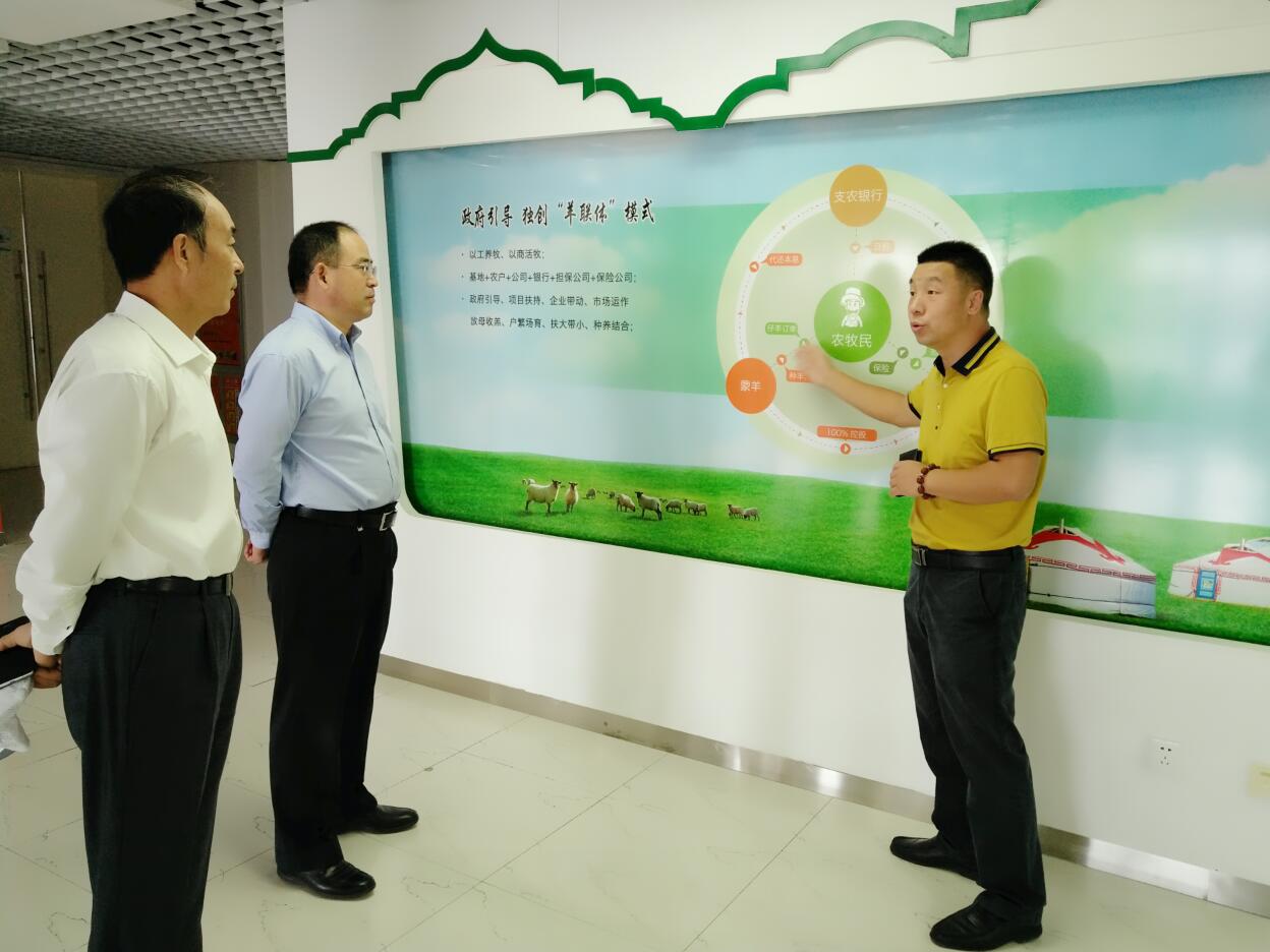 調(diào)研組一行首先參觀協(xié)會(huì)會(huì)長(zhǎng)單位羊牧業(yè)股份有限公司,在聽取協(xié)會(huì)會(huì)長(zhǎng)、蒙羊牧業(yè)副董事長(zhǎng)閆樹春的介紹后,調(diào)研組一行詳細(xì)了解了蒙羊的“生產(chǎn)鏈”和“羊聯(lián)體”模式,并指出“羊聯(lián)體”模式是一種很好的模式,企業(yè)發(fā)展帶動(dòng)農(nóng)牧戶致富,并由企業(yè)出資擔(dān)保農(nóng)牧戶,降低銀行、保險(xiǎn)的風(fēng)險(xiǎn),這種模式既新穎又可控風(fēng)險(xiǎn)。調(diào)研組一行表示,今后銀行等各類金融機(jī)構(gòu)可以加大參與力度,讓金融資本更大程度上的支持內(nèi)蒙古農(nóng)牧業(yè)發(fā)展。