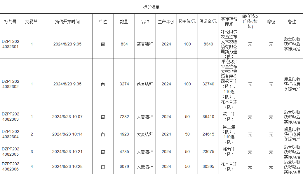 轉(zhuǎn)讓標(biāo)的為莜麥秸稈、燕麥秸稈、大麥秸稈,涉及面積莜麥秸稈834畝、燕麥秸稈3274畝、大麥秸稈(1-4標(biāo))分別為7282畝、4923畝、4735畝、6079畝,意向受讓方在競買前應(yīng)自行對(duì)標(biāo)的預(yù)估數(shù)量和質(zhì)量情況進(jìn)行充分了解,交易標(biāo)的均以實(shí)際狀況為準(zhǔn)。標(biāo)的存放地位于呼倫貝爾農(nóng)墾拉布大林農(nóng)牧場(chǎng)有限公司,詳情見標(biāo)的清單: