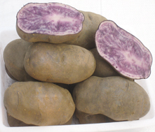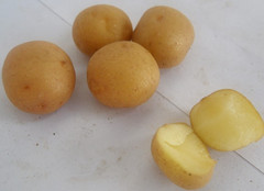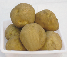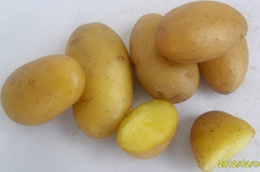 FAVORITA(費烏瑞它)1981年由國家農業(yè)部種子局從荷蘭引入,山東省農業(yè)科學院蔬菜花卉所引入山東栽培,取名“魯引1號”,1989年天津市農業(yè)科學院蔬菜花卉所引入,取名“津引8號”,又名“荷蘭薯”、“荷蘭七號”、“荷蘭15”,為我國主栽早熟品種之一,該品種出苗后60—70天即可收獲。 [特征特性]該品種早熟,株型直立,株高約60cm左右,莖桿粗壯,分枝少,葉片肥大,葉緣波狀,花淡紫色;結薯集中,薯塊膨大迅速,長橢圓形,芽眼淺,黃皮黃肉,表皮光滑,食味好,適合加工和出口創(chuàng)匯,在香港及東南亞各國極為暢銷;抗馬鈴薯Y病毒,對A病毒免疫;淀粉12.4%—14%,還原糖0.03%。植株易感晚疫病。塊莖感晚疫病和環(huán)腐病。輕感青枯病、退化快。產量高,畝產2000kg,高產可達3000kg以上。 [適宜范圍]該品種適宜性較廣,黑龍、遼寧、內蒙古、河北、北京、山東、江蘇、廣東、廣西、貴州、四川等地均有種植,是適宜出口的品種。